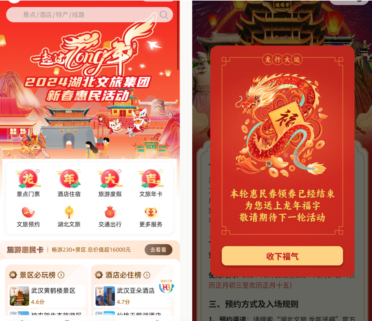 惠民政策積極落實(shí)。為保障湖北文旅“龍年送福”活動(dòng)工作有序進(jìn)行,數(shù)旅集團(tuán)一卡通公司積極部署,組織技術(shù)研發(fā)、運(yùn)營等工作專班開發(fā)活動(dòng)平臺(tái),在除夕、大年初一晝夜加班,對(duì)接十一個(gè)地市州文旅局,數(shù)百家景區(qū)企業(yè),順利完成湖北文旅龍年送?;顒?dòng)60萬張免費(fèi)惠民門票的預(yù)約及核銷工作,并承擔(dān)游客入園等相關(guān)客服、客訴問題處理。