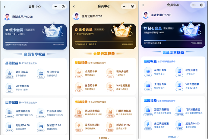 平臺以消費、信用和活躍度為核心要素,會員通過消費、參與活動、打卡等方式獲取成長值“小旅豆”,完成從銀卡會員升級至金卡會員和鉆石卡會員的成長,享受不同等級的專屬折扣、多倍積分、積分當(dāng)錢花、優(yōu)先預(yù)訂、快速通道、會員日、生日月、跨境禮包、定制服務(wù)等權(quán)益。