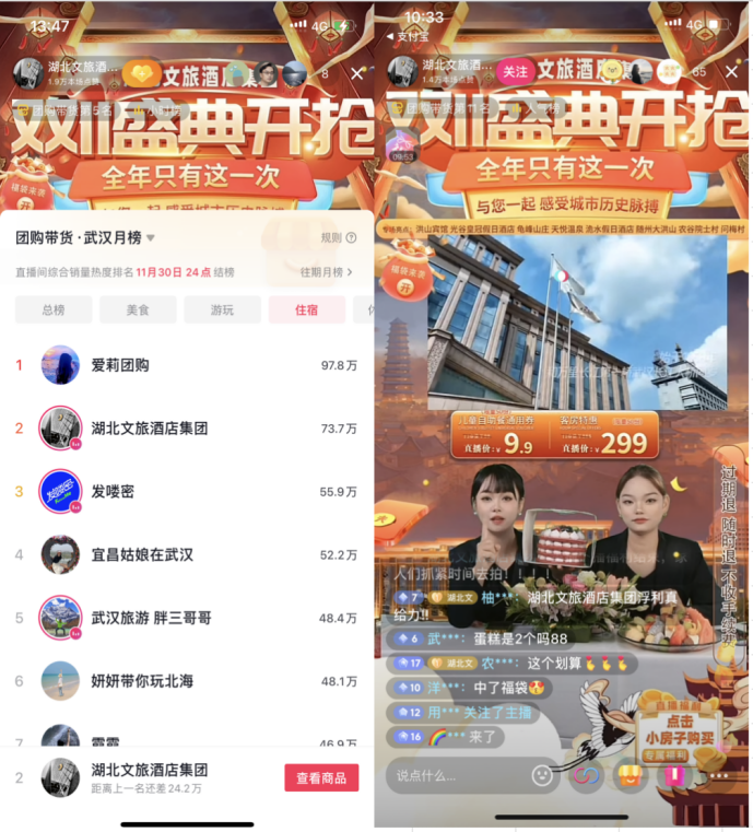 本周熱點(diǎn) 數(shù)旅集團(tuán)聯(lián)手酒店集團(tuán)“雙十一”直播,躋身武漢團(tuán)購(gòu)帶貨榜單月榜第2名。近日,湖北文旅酒店集團(tuán)雙十一抖音首播儀式在湖北洪山賓館正式開播,湖北數(shù)字文旅集團(tuán)為本次雙十一直播活動(dòng)服務(wù)商,通過湖北文旅酒店集團(tuán)抖音官方賬號(hào)以“雙十一游湖北·酒店必囤攻略“為主題進(jìn)行直播帶貨。短短1個(gè)小時(shí)就沖上武漢團(tuán)購(gòu)帶貨榜單月榜第2名,整場(chǎng)直播吸引了近2萬人次觀看,收獲了近10萬點(diǎn)贊,累計(jì)曝光超過15萬次,首場(chǎng)直播GMV已達(dá)到31萬。直播現(xiàn)場(chǎng)氣氛熱烈,多款產(chǎn)品上架即刻秒空,送福袋、特價(jià)秒殺、爆款產(chǎn)品等,各種驚喜、福利不斷,現(xiàn)場(chǎng)掀起一波又一波互動(dòng)高潮。 支付寶文旅行業(yè)總經(jīng)理萬劍到數(shù)旅集團(tuán)交流座談。近日,支付寶文旅事業(yè)部總經(jīng)理萬劍一行來到湖北數(shù)字文旅集團(tuán),就相關(guān)合作事項(xiàng)交流座談。座談會(huì)上,湖北數(shù)字文旅集團(tuán)副總經(jīng)理樊后濤介紹了數(shù)字文旅集團(tuán)在線旅游運(yùn)營(yíng)、“一部手機(jī)游湖北”平臺(tái)以及湖北文旅一卡通等相關(guān)情況,介紹了去年以來在與支付寶合作的數(shù)字藏品、數(shù)字紀(jì)念票、場(chǎng)景引流等相關(guān)情況,并表示,將繼續(xù)發(fā)揮“游湖北”在湖北省全域文旅資源、流量、產(chǎn)品、渠道、運(yùn)營(yíng)等優(yōu)勢(shì),與支付寶深化合作。萬劍對(duì)前期合作取得的成效給予高度評(píng)價(jià),他表示,將繼續(xù)發(fā)揮支付寶的獨(dú)特生態(tài)優(yōu)勢(shì),運(yùn)用好支付寶的產(chǎn)品體系、信用體系、支付體系、會(huì)員體系等,推動(dòng)雙方全方位的深度合作。會(huì)上,雙方就在湖北省內(nèi)重要文旅場(chǎng)景的平臺(tái)引流、系列營(yíng)銷活動(dòng)的推廣、消費(fèi)券等惠民政策的釋放、文旅龍頭資源的品牌宣傳、線上二消的帶動(dòng)等達(dá)成共識(shí)。 湖北文旅集團(tuán)蟬聯(lián)2023湖北企業(yè)“雙百?gòu)?qiáng)”。近日,“2023湖北企業(yè)三項(xiàng)100強(qiáng)”發(fā)布會(huì)在武漢洪山賓館召開,會(huì)議公布了2023湖北企業(yè)100強(qiáng)、2023湖北服務(wù)業(yè)100強(qiáng)名單。集團(tuán)連續(xù)兩年榮登雙百?gòu)?qiáng)榜單,位居湖北企業(yè)100強(qiáng)第44位、服務(wù)業(yè)100強(qiáng)第16位,排名較去年分別進(jìn)位18位、6位。作為省委、省政府本輪改革首批重組企業(yè),集團(tuán)錨定文化旅游、體育康養(yǎng)、商業(yè)貿(mào)易三大主業(yè),聚焦改革創(chuàng)新、踐行經(jīng)營(yíng)為王,持續(xù)推動(dòng)文旅體康商融合發(fā)展,以機(jī)制創(chuàng)新驅(qū)動(dòng)業(yè)務(wù)革新,以效益效率重新構(gòu)建賽道運(yùn)營(yíng),不斷邁向高質(zhì)量發(fā)展新征程。 最新資訊 ● 喜報(bào)!湖北文旅集團(tuán)2個(gè)項(xiàng)目入選省級(jí)夜間消費(fèi)集聚區(qū)。近日,湖北省發(fā)展和改革委員會(huì)公布了2023年湖北省20個(gè)夜間消費(fèi)聚集區(qū)名單。湖北文旅集團(tuán)旗下黃梅·東山問梅村、湖北文旅·荊街2個(gè)夜間消費(fèi)集聚區(qū)成功入選。 ● 溫泉游熱度暴漲,預(yù)定量較往年提前一周。近日,全國(guó)多地呈斷崖式降溫。根據(jù)中央氣象臺(tái)預(yù)報(bào),繼北方雨雪天氣之后,中東部氣溫也將在本周末前后大面積創(chuàng)新低。據(jù)數(shù)據(jù)顯示,自上周末以來,“溫泉”和“滑雪”關(guān)鍵詞搜索熱度上升顯著,環(huán)比前5日增長(zhǎng)50%;冰雪游、溫泉游預(yù)訂熱也比去年提前一周左右。此外,三亞、北海等溫度適宜的南方城市也開始迎來避寒游客,近七成旅行者啟程時(shí)間早于往年。另外,含溫泉的景區(qū)門票預(yù)訂量環(huán)比前5日增長(zhǎng)約140%,同比去年增長(zhǎng)翻倍;而包含“溫泉”、“私湯”、“泡湯”標(biāo)簽的酒店預(yù)訂量環(huán)比前5日增長(zhǎng)近兩成,同比去年增長(zhǎng)超過150%。 ● 湖北擬建文旅推介官工作室。近日,湖北省文化和旅游廳印發(fā)通知,未來3年,湖北省文化和旅游廳計(jì)劃每年分類建設(shè)一批湖北文旅導(dǎo)師工作室。其中,2023年度重點(diǎn)支持建設(shè)一批宣傳湖北文旅資源的文旅推介官工作室。據(jù)介紹,文旅推介官工作室屬于湖北文旅導(dǎo)師工作室總體項(xiàng)目建設(shè)內(nèi)容之一,全稱為“湖北省+領(lǐng)辦人姓名+文旅推介官工作室”,主要任務(wù)是講好湖北故事,擴(kuò)大荊楚文化和旅游資源影響,具體工作要求是參與行業(yè)培訓(xùn),開展人才結(jié)對(duì)幫帶,開展宣傳推介等。湖北省文化和旅游廳將大力支持文旅推介官工作室建設(shè)發(fā)展,給予入選工作室經(jīng)費(fèi)支持,同等條件下優(yōu)先支持工作室及領(lǐng)辦人牽頭或參與省內(nèi)重大文旅項(xiàng)目,加強(qiáng)對(duì)創(chuàng)新成果、典型事跡的宣傳推介。 ● 授牌!恩施州是湖北省第1個(gè),全國(guó)第6個(gè)!近日,以“走進(jìn)天然氧吧,感受生態(tài)恩施”為主題的第五屆“中國(guó)天然氧吧”產(chǎn)業(yè)發(fā)展大會(huì)在湖北省恩施州舉辦。會(huì)上恩施州被授予“天然氧吧州”稱號(h